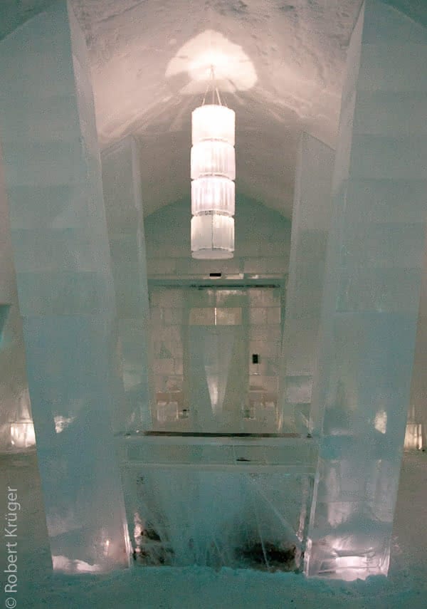 Wie ist es nun also eine Nacht bei -5°C zu verbringen? Eigentlich ziemlich nett. Man schläft also auf einem Bett aus Eis, auf diesem liegt eine Matratze, darauf das obligatorische Rentierfell. Bis hierher ist man schon mal recht gut von der Kälte isoliert, aber natürlich bleibt die Luft kalt also muss noch ein Schlafsack her. Dieser wird inklusive eines baumwollenen Hygiene-Inlays vom Hotel zur Verfügung gestellt.